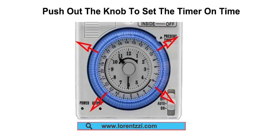 - Lorentzzi® TB388 est une minuterie mécanique programmable sur 24 heures. En poussant le cadran vers l'extérieur, cette minuterie peut allumer la charge en conséquence. Voir la photo de fonctionnement ci-dessous :